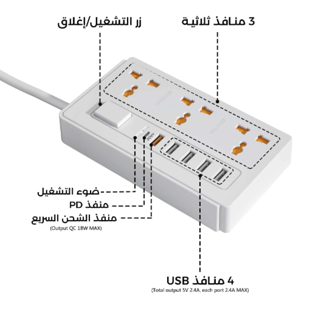 3- تحتوي على ثلاث منافذ كهرباء و 4 منافذ USB ومنفذ PD تدعم الشحن السريع